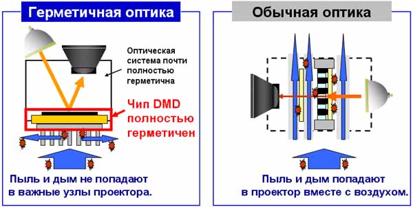Нет значительного изменения качества картинки после использования DLP проектора в течение 4100 часов. Герметично закрытая оптика Оптическая система полностью герметична, предотвращая попадание пыли, грязи и дыма в наиболее важные узлы проектора.