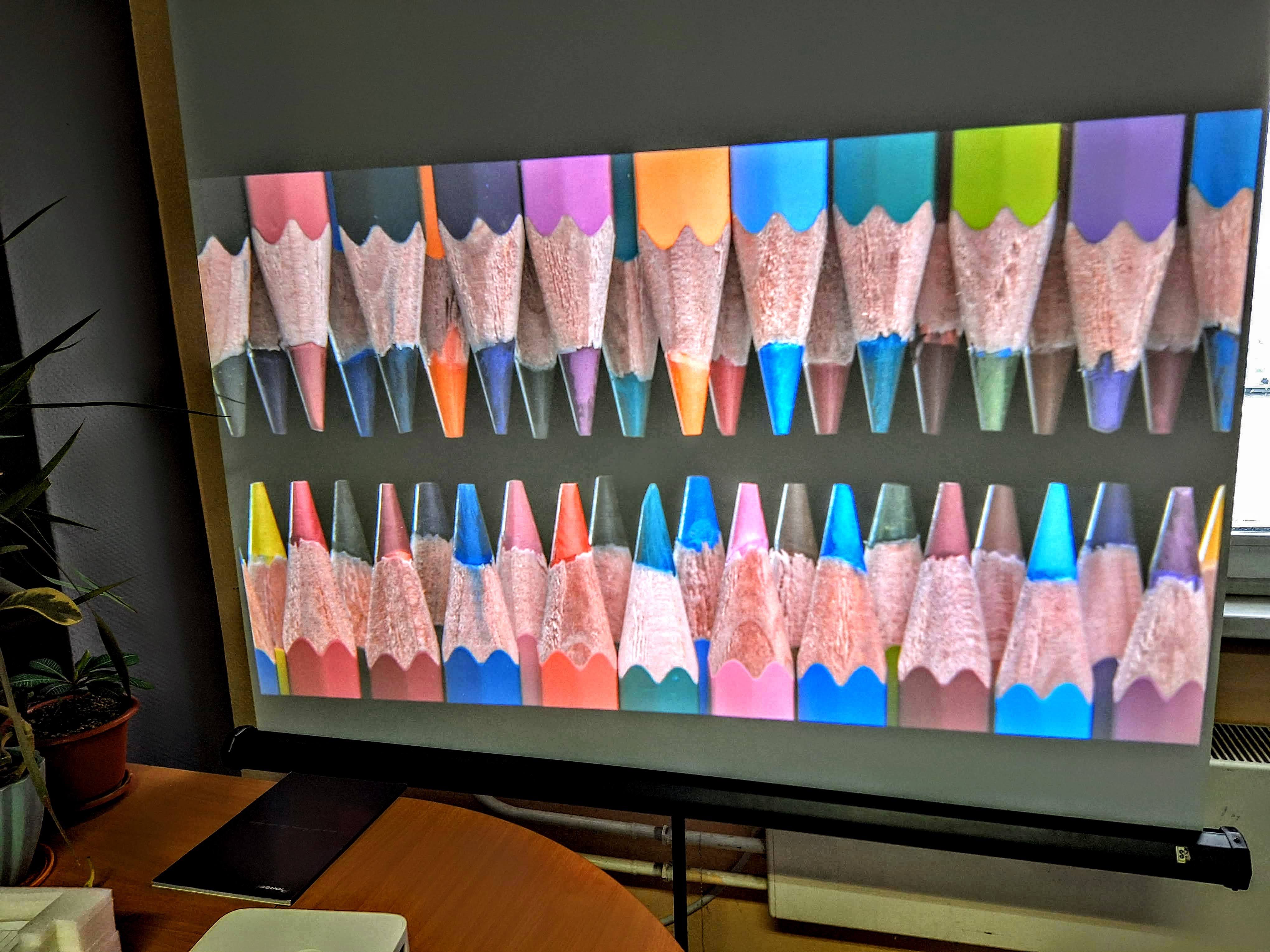 - Высокая однородность яркости по всему полю проекции, что определяется качеством линзы френеля - оптическое устройство, которое выглядит как "радиальная стеклянная стиральная доска", которые часто штампуют из пластика и результат получается плачевным, стремительно ухудшающимся с ростом срока эксплуатации проектора.