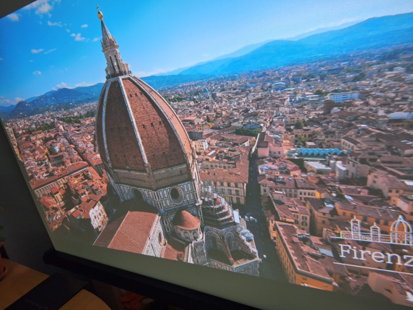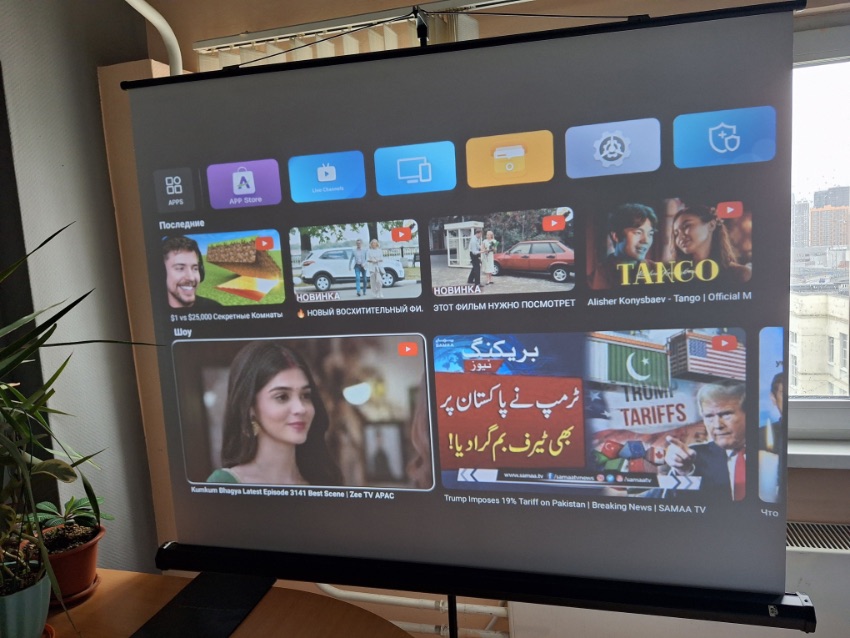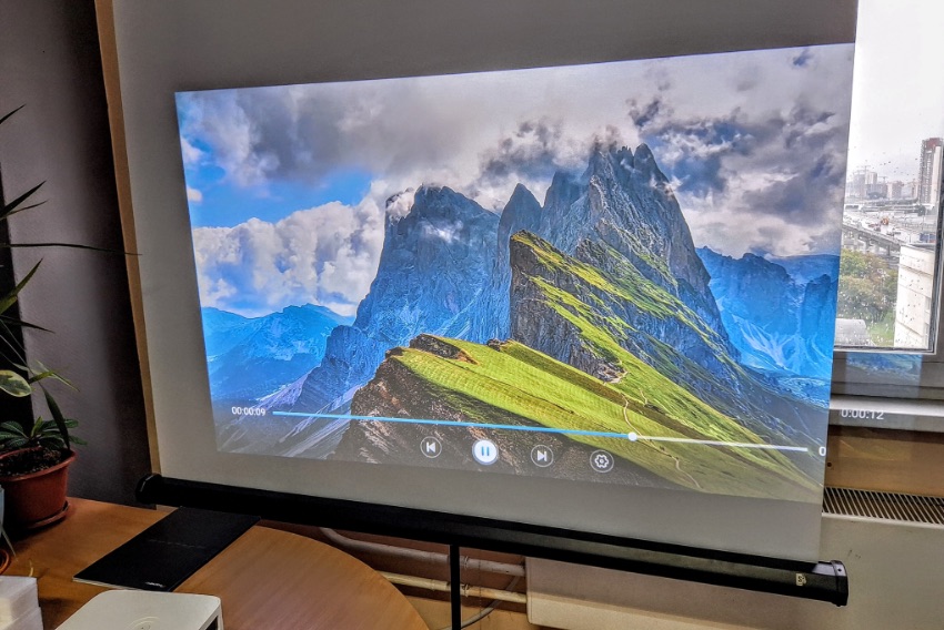 ■ ЯРКОСТЬ - Обе модели относятся к категории настольных проекторов с возможностью установки сбоку от экрана и имеют необходимые для этого автофокусировки и автоматические коррекции геометрии изображения. Оба имеют FullHD разрешение, одинаковую смарт начинку, скорее всего используют одинаковый 1LCD проекционный дисплей и по результатам воспроизведения изображения выглядят очень похоже, но с разницей по яркости, которую фото не отражают, и предлагаем поверить на слово: в затемненном помещении модель E01 отлично справляется с экранами 80", а E10 с 100". Да это не яркость эталонного классического лампового проектора мощностью 300 Вт, но близко, а с учетом 5-кратной разницы в цене даже очень близко. На фото ниже видно день за окном, то есть это яркость изображения даже в не полностью затемненном помещении.