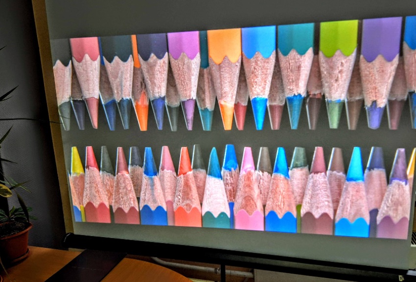 ■ ПИКСЕЛИЗАЦИЯ - Это оказалось полным сюрпризом - она вообще отсутствует, виден рельеф полотна экрана, а межпиксельной решетки нет. Чудес не бывает и она есть, но увидеть и заснять не удалось, хотя фокусировали и проекторы и камеру с пристрастием.